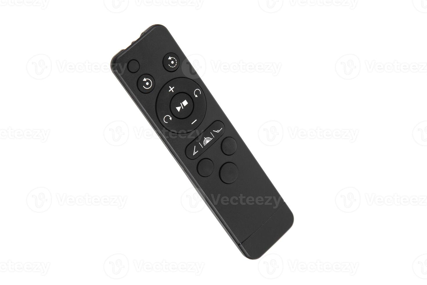A black remote control with various buttons, shot from an angle. Wireless remote control for a gadget Pro Photo