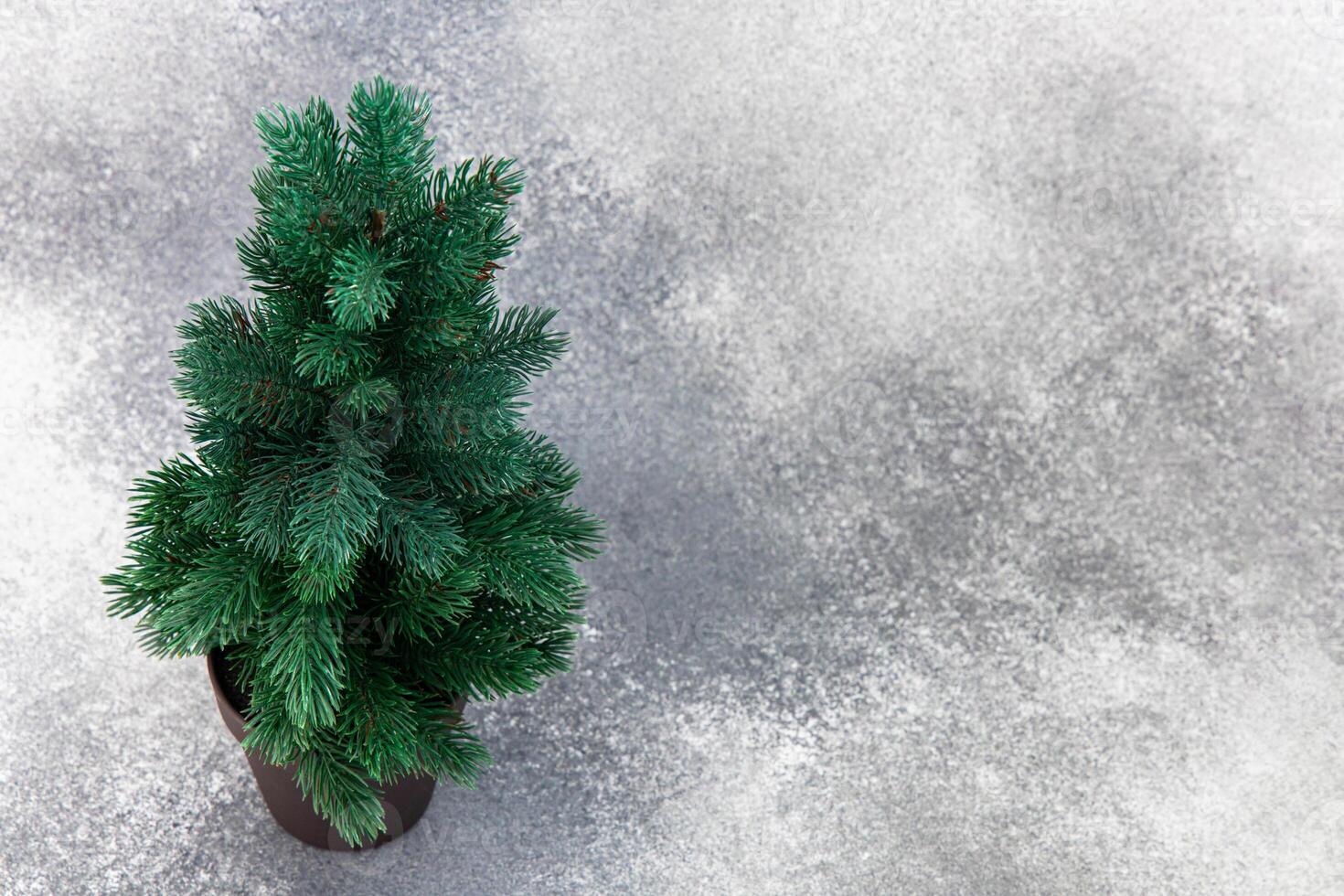 Small green artificial tree in a pot on a textured gray background space for text Pro Photo