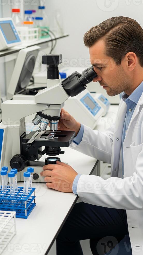Focused Scientist Using Advanced Microscope in Modern Lab Pro Photo