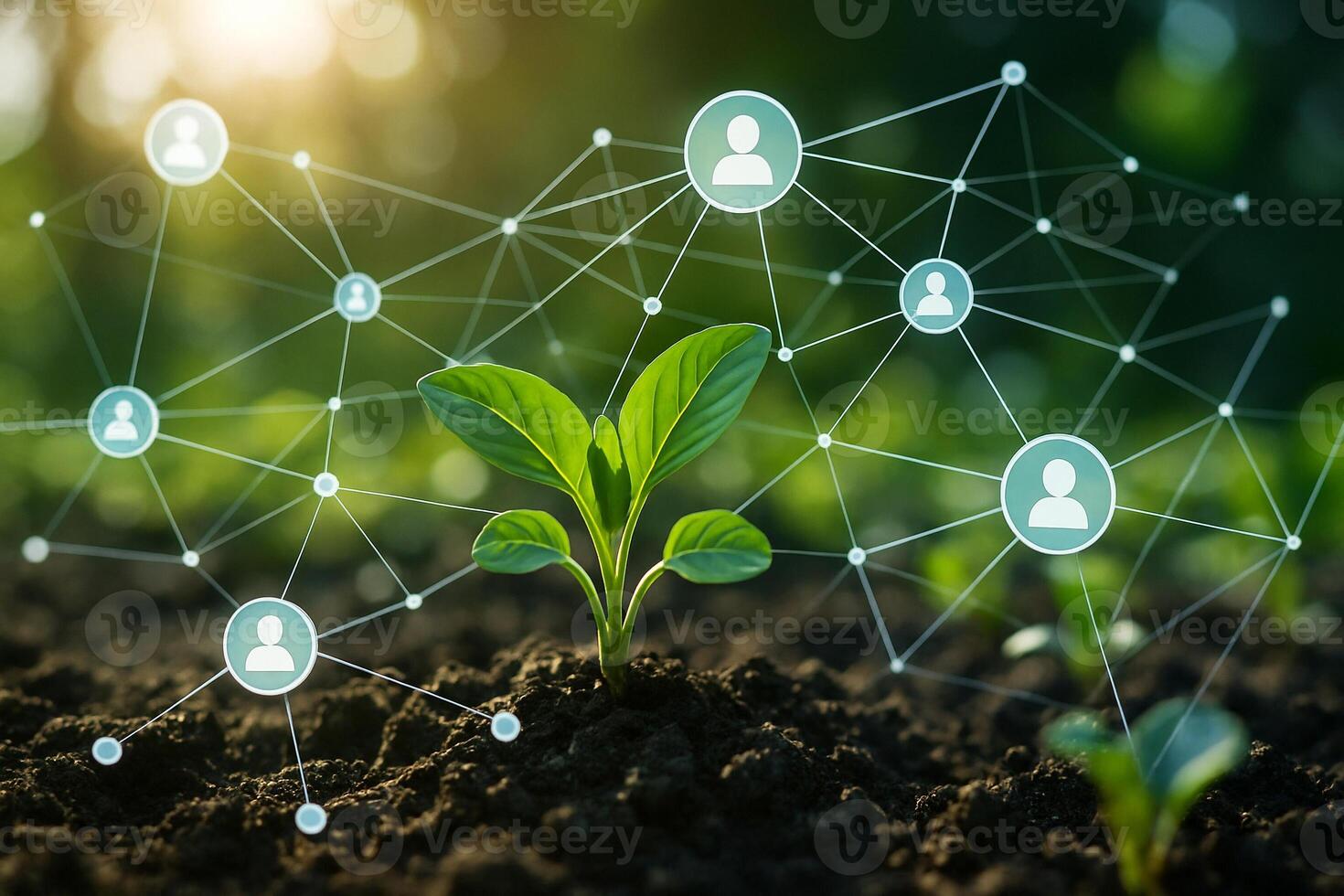 symbolic image of green seedling with digital network overlay representing collaborative smart farming system and data driven agricultural ecosystem Pro Photo