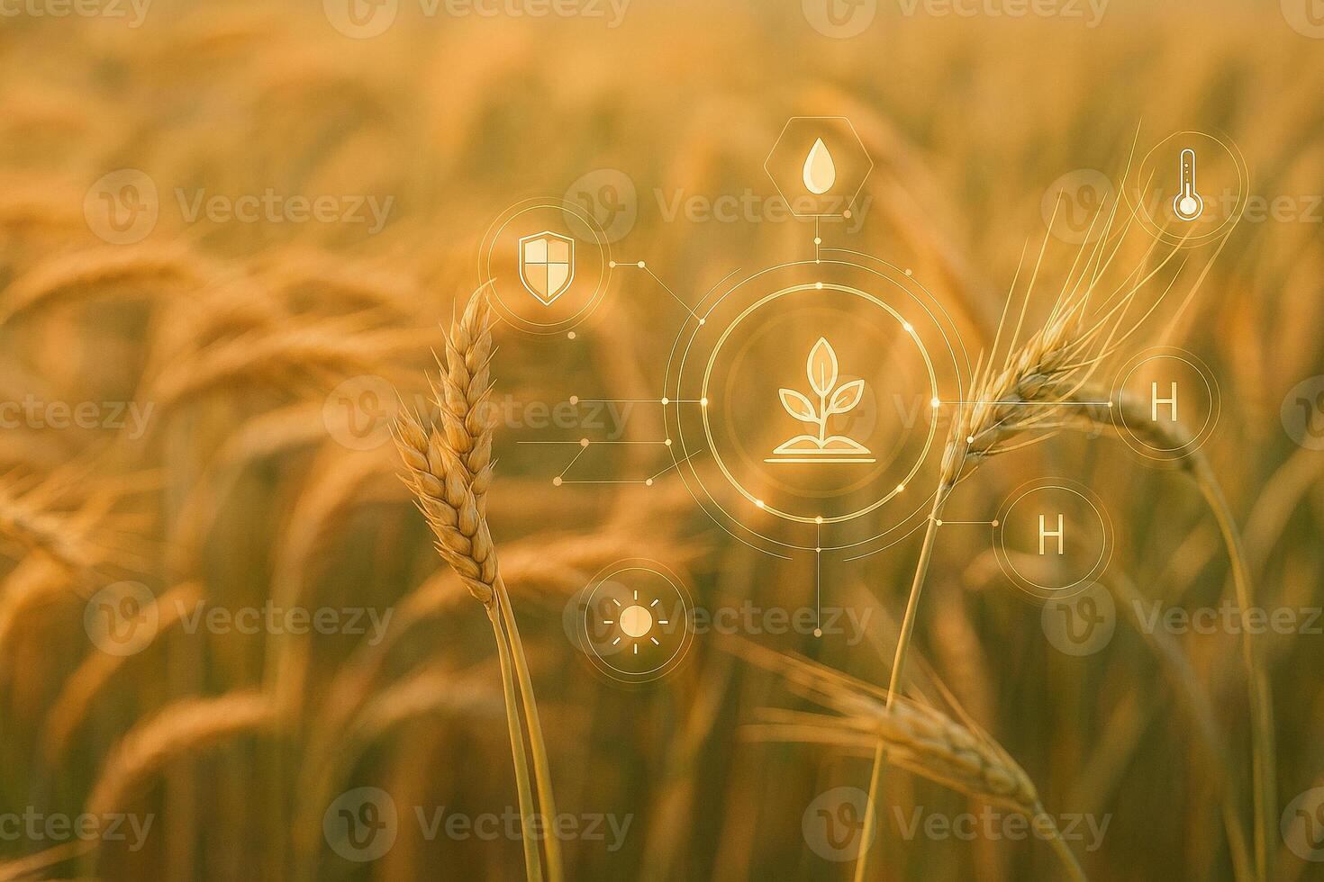 ultra realistic image of wheat field with glowing digital icons representing smart farming data analysis crop monitoring and sustainable agricultural technology in warm natural light Pro Photo