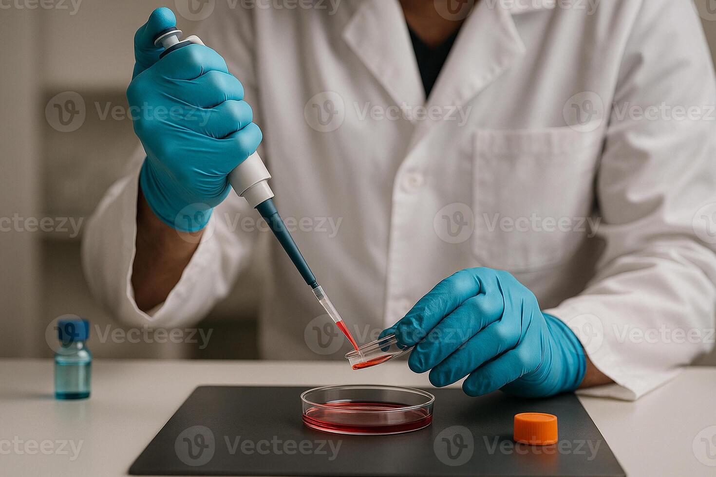 scientist in lab coat using pipette with red liquid in sterile laboratory showing precision biotechnology research and sterile handling in science environment Pro Photo