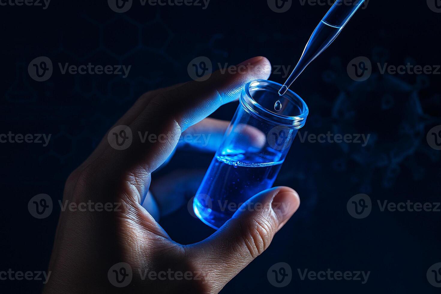 macro shot of a hand holding a glass container with blue liquid while a pipette drops liquid inside in a futuristic science laboratory setting Pro Photo