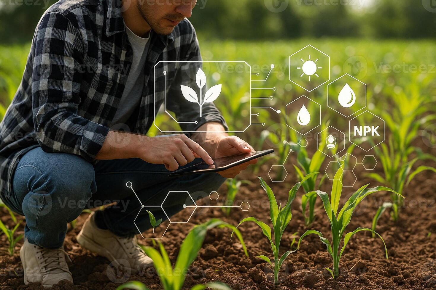 smart farming concept with young man using tablet in crop field enhanced with digital overlay to monitor plant health nutrients and moisture in real time Pro Photo