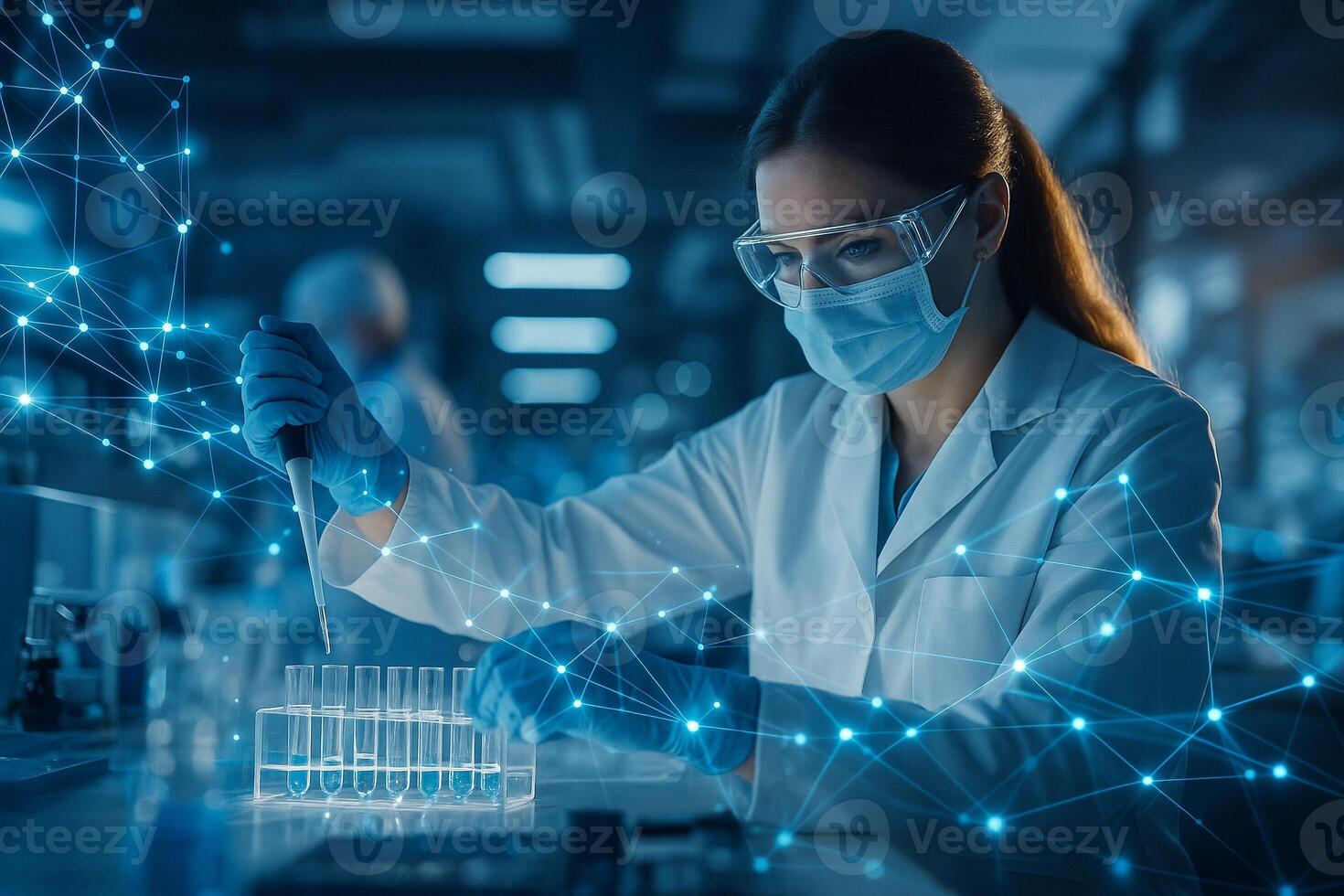 female scientist wearing mask and safety glasses using pipette in advanced laboratory with glowing network lines representing innovation and biotechnology Pro Photo