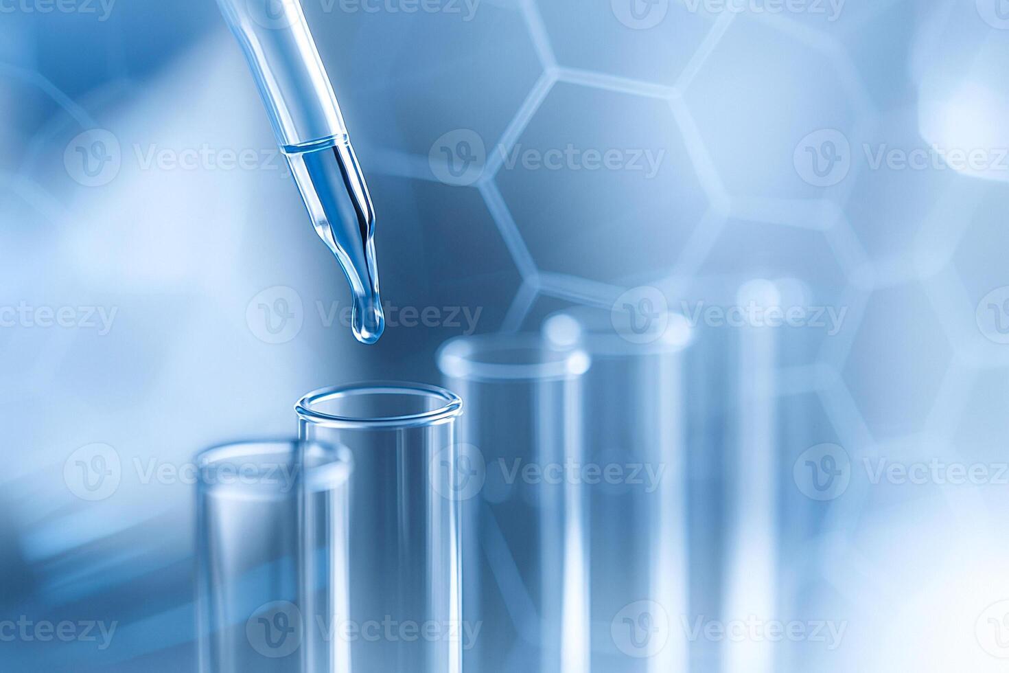 close up of blue liquid droplet from pipette falling into clear test tubes with hexagonal abstract background symbolizing precision technology and scientific innovation Pro Photo