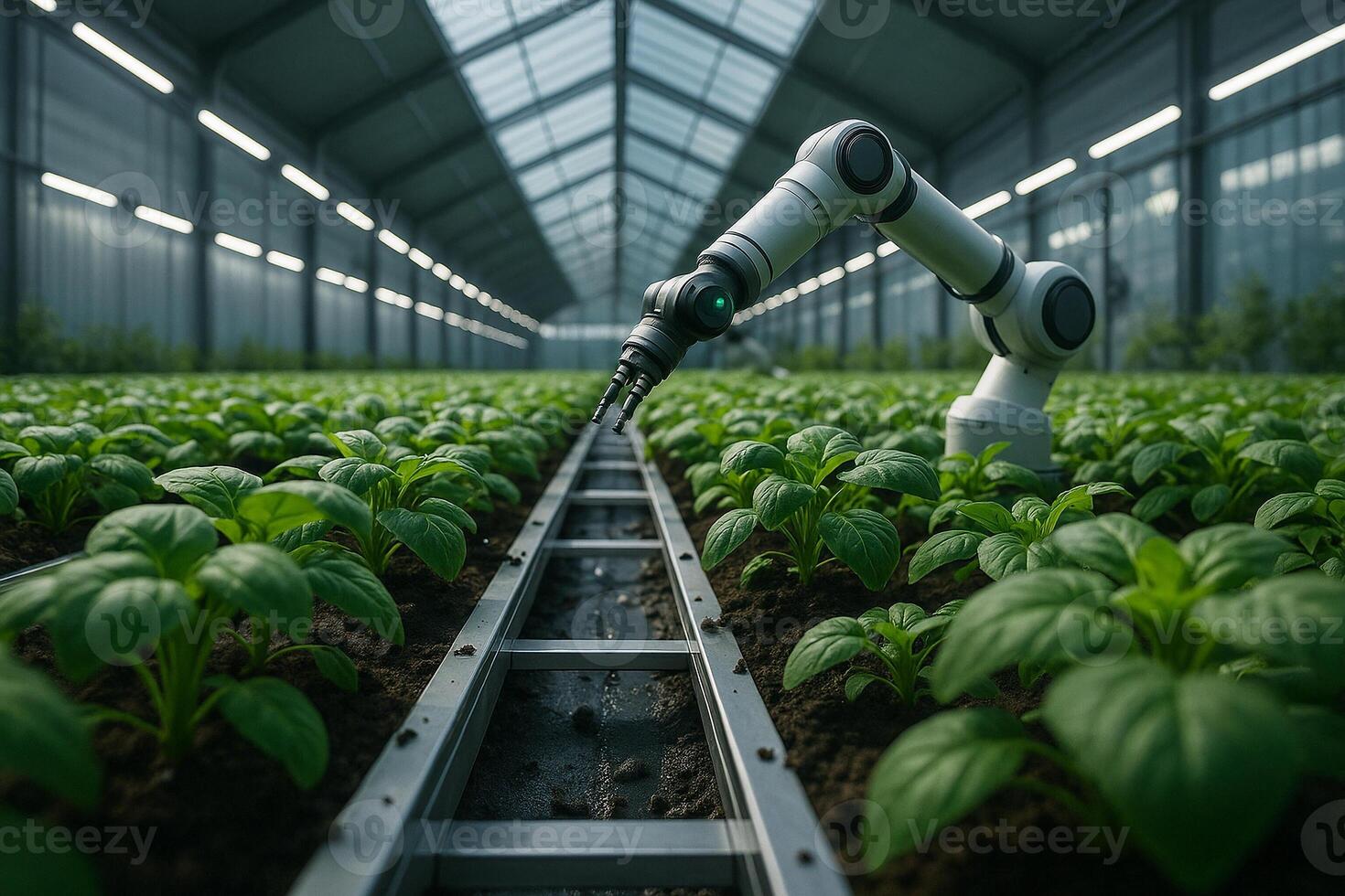 robotic arm working with green crops in a high tech greenhouse using automation and precision farming to monitor and manage plant growth in controlled environment Pro Photo