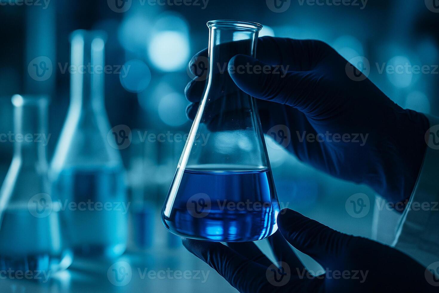 close up of gloved hand holding an Erlenmeyer flask with blue liquid in modern laboratory with glassware in background clean and precise atmosphere Pro Photo