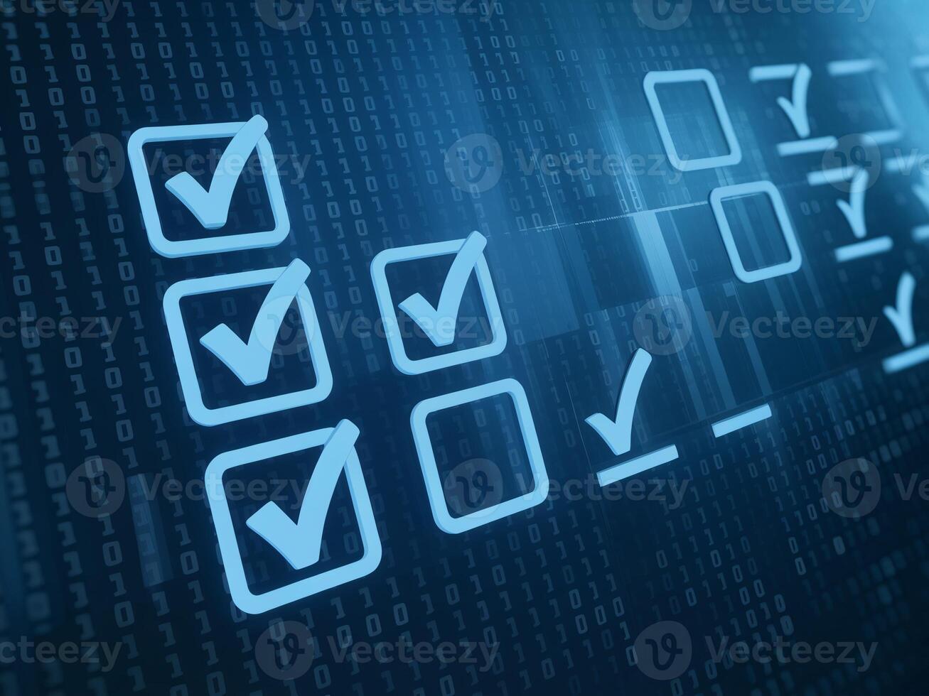 Digital checklist with glowing checkmarks on a blue binary background, symbolizing task completion. Pro Photo