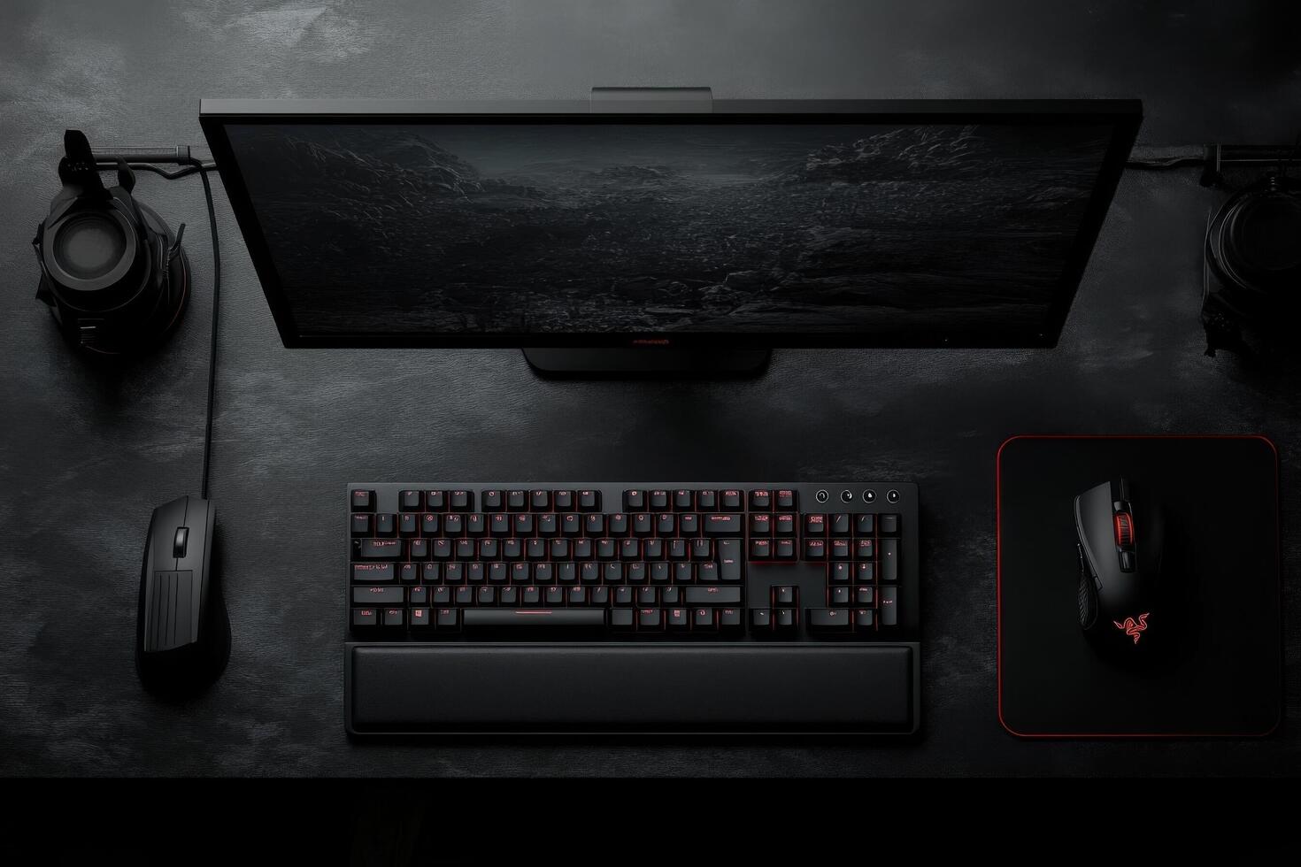 A black desk with a computer, mouse and keyboard Free Photo