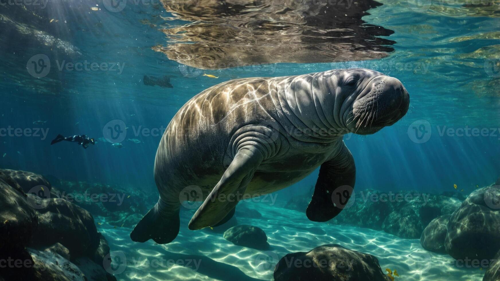 Underwater view of a serene manatee gliding through clear waters, surrounded by rocks and divers exploring Pro Photo