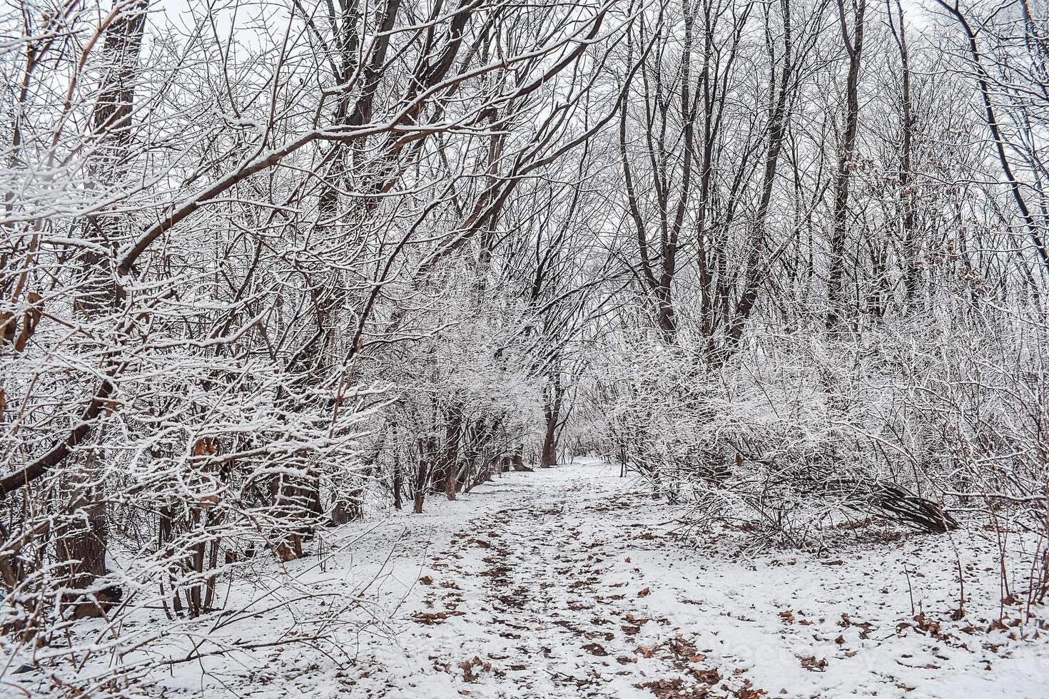 The park is covered with a thin layer of snow in winter.. The park with tall trees and paths is covered with snow. Pro Photo