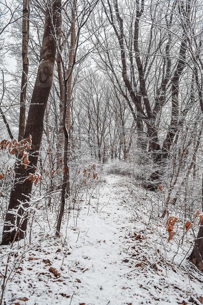 The park is covered with a thin layer of snow in winter. The park with tall trees and paths is covered with snow.. Pro Photo