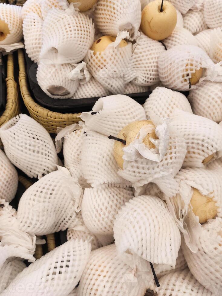 Top angle shot of yellow pears wrapped with Polyethylene foam in grocery store. A pile of pears covered by a fruit net to protect them from bumps and scratches. Graphic Resources. Negative space Pro Photo