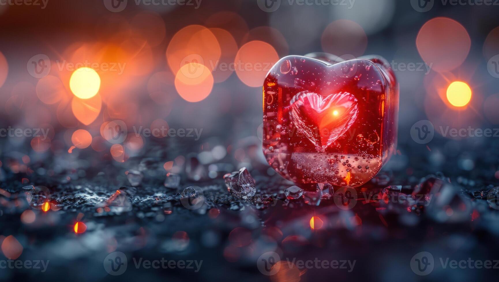 Heart in ice cube macro with bokeh lights background Pro Photo