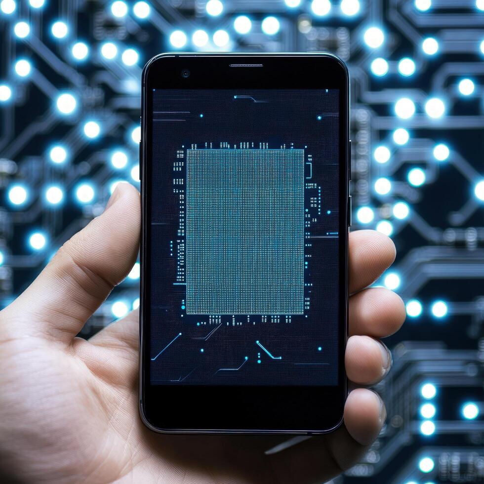 Smartphone displaying a circuit grid design for advanced mobile technology photo