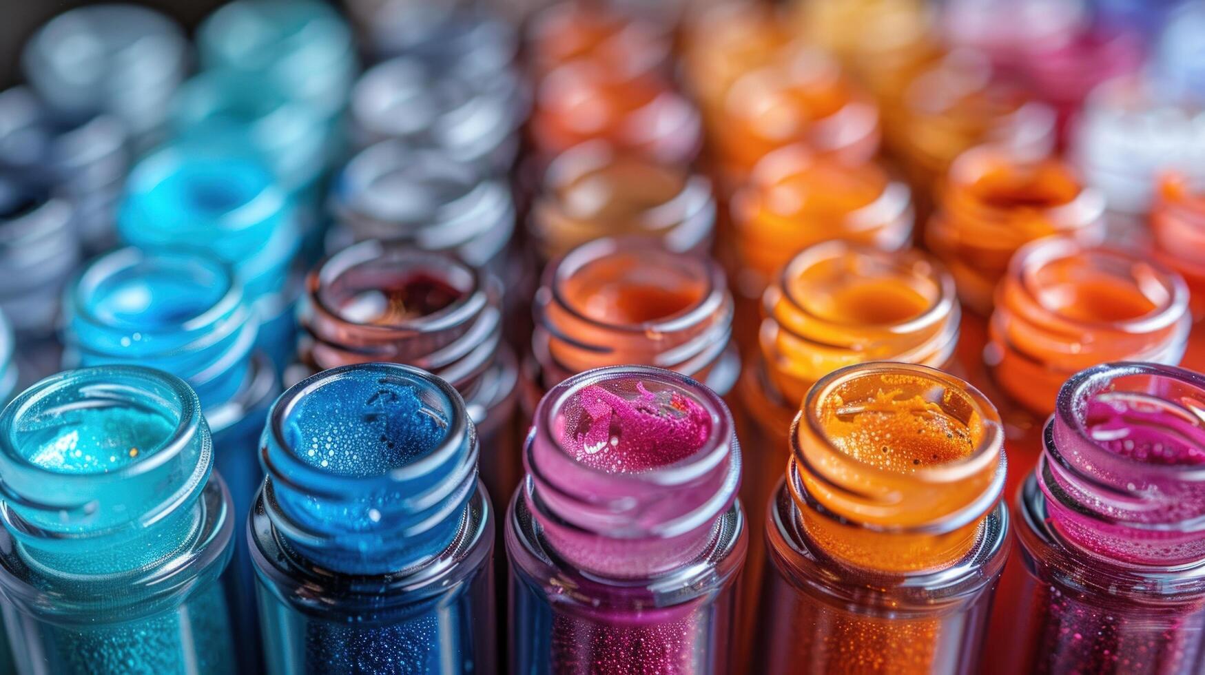 Colorful pigment powders displayed in glass jars creating a textured gradient background photo