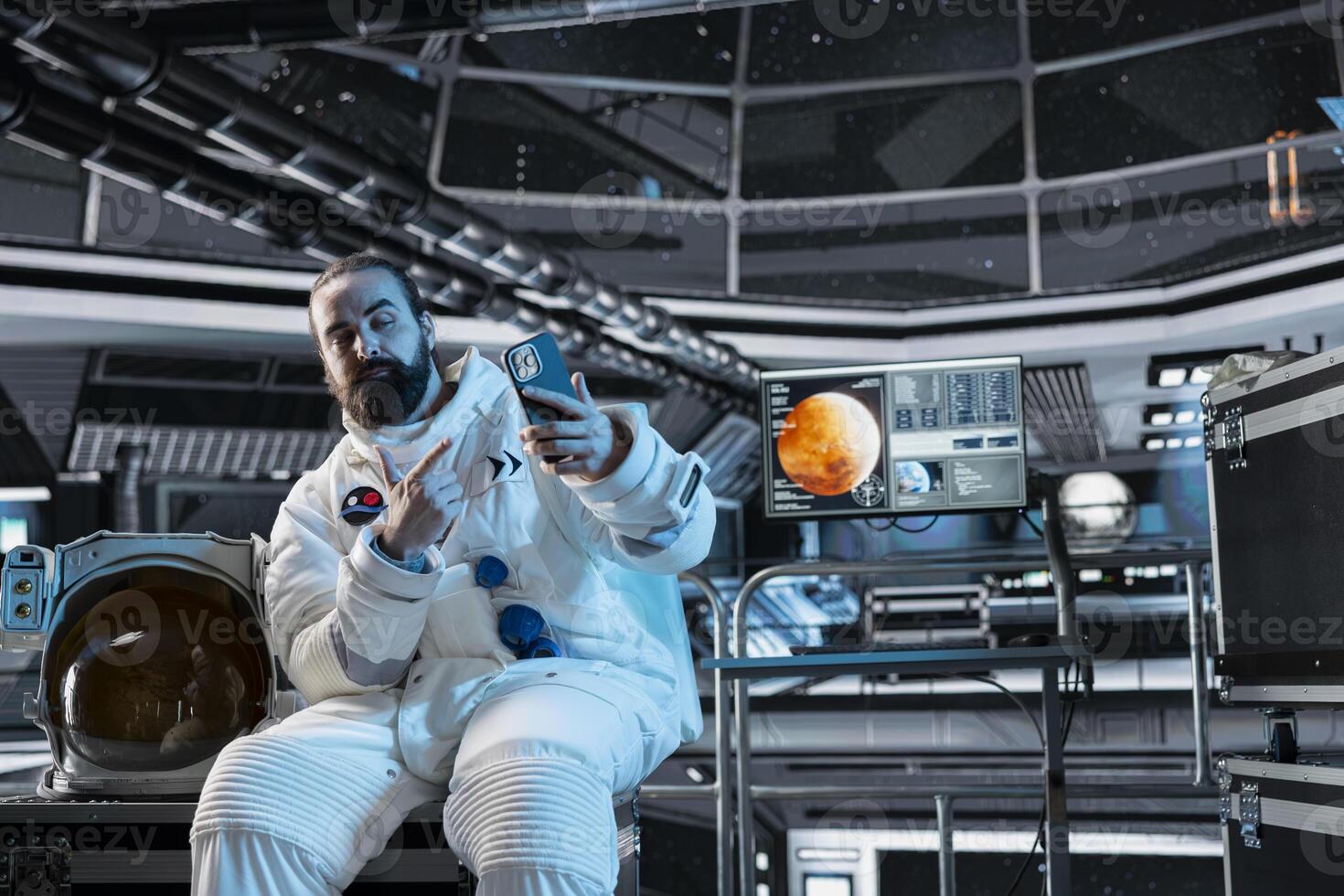 Astronaut on orbital station talking selfies with smartphone while flying to Mars. Astronaut in spaceship taking pictures with mobile phone during red planet surface research expedition Pro Photo