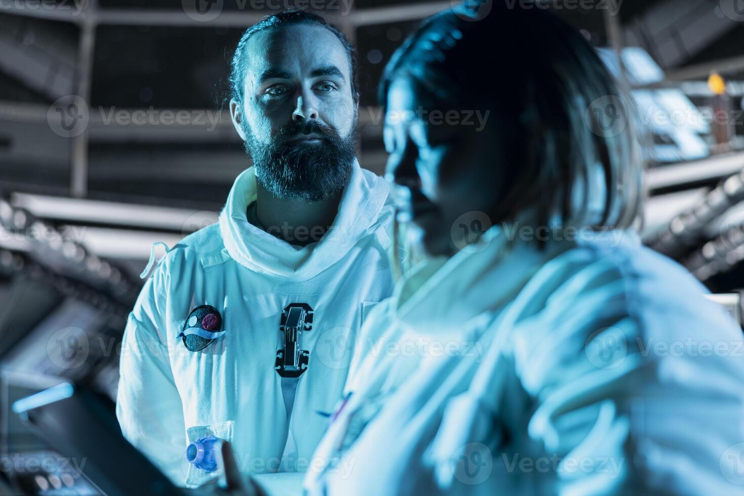 Cosmonauts flying in starship powered by advanced engineering during cosmic journey. Astronauts calibrating spaceship sensors, conducting safety checks using tablet during long distance space travel Pro Photo