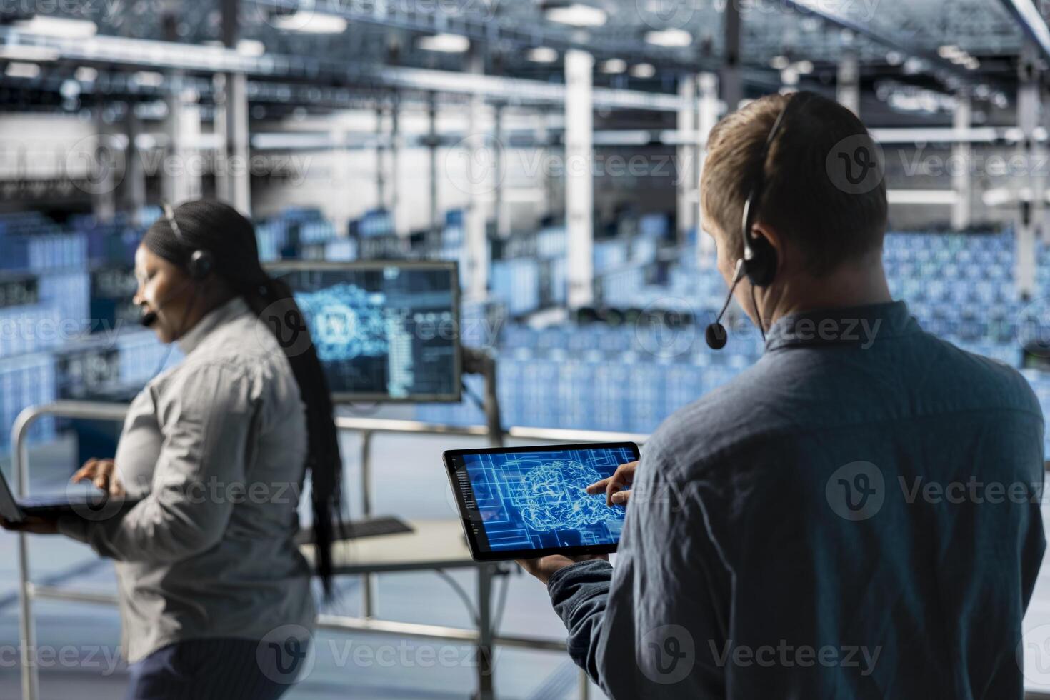 Man in server farm using artificial intelligence tech on device, talking in headset mic. Close up of data center operator using tablet, assisting customers with AI enhanced troubleshooting Pro Photo