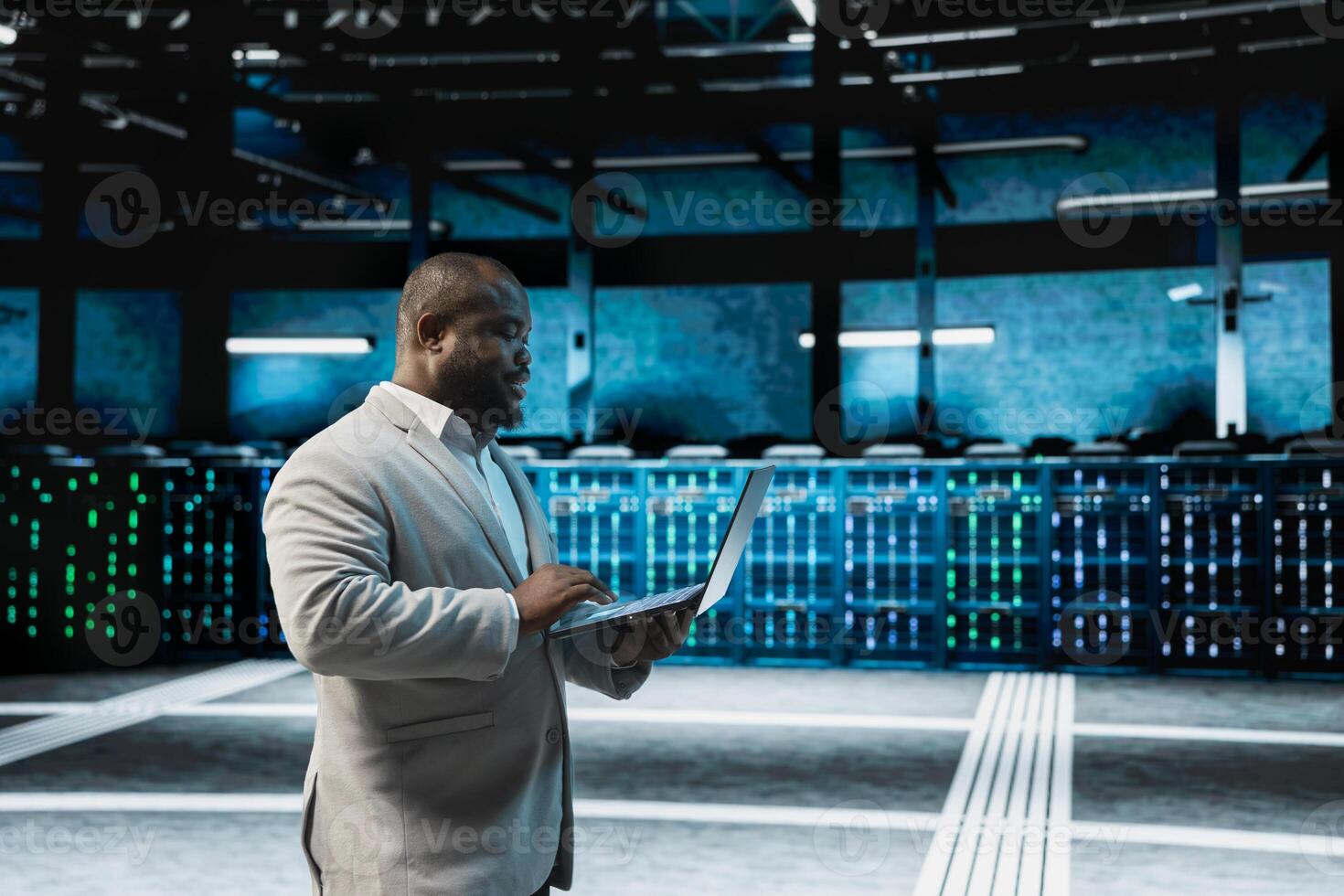 Developer in data center updating systems using laptop, protecting mainframes from damaging software errors. Server hub IT expert using notebook, looking for malfunctions causing gear to slow down Pro Photo