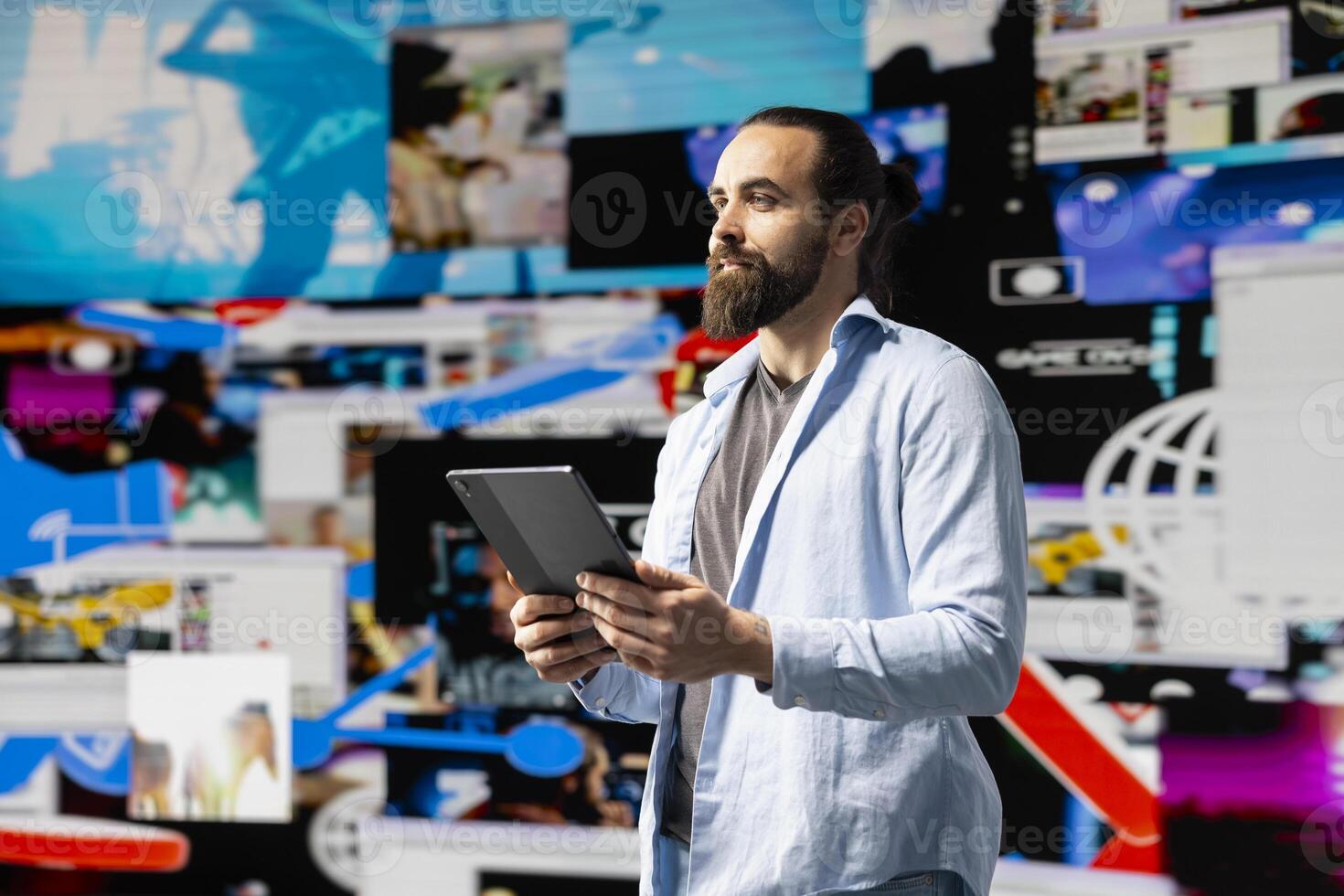 Digital lifestyle of a trend setter navigating real time notifications, enjoying live stream interaction and creative content in a modern virtual social network environment. Online presence. Pro Photo