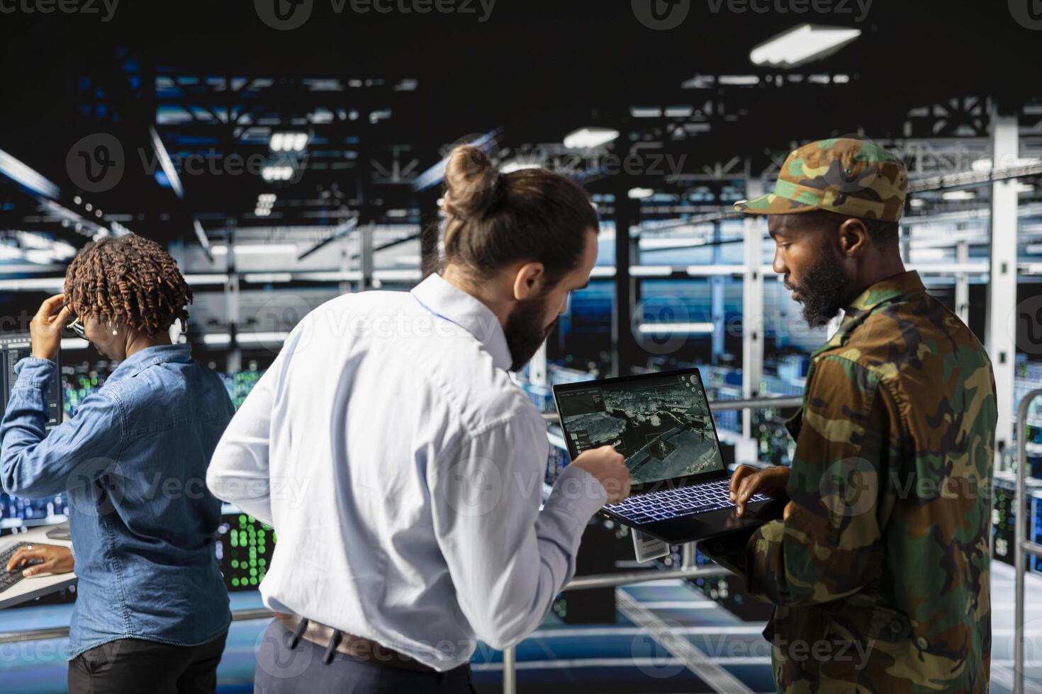 Army technicians using laptop to install server security systems in command center server farm. Military data center engineer and soldier overseeing computer networks for hybrid warfare. Pro Photo