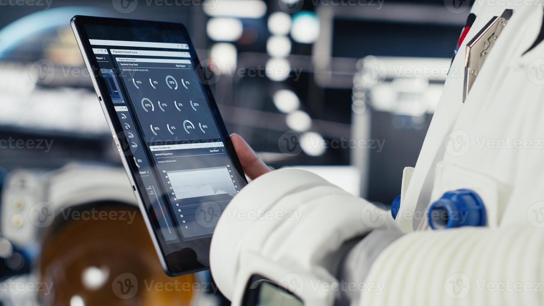 Close up of astronaut using tablet to check logs after completing red planet surface mission. Cosmonaut leaving Mars, updating flight log on device to return home Pro Photo