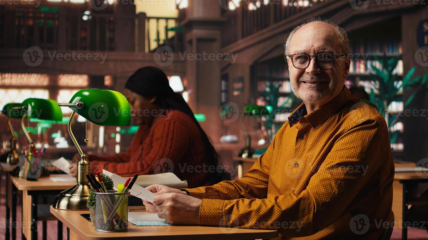 Aged man in a study area surrounded by library books and paperwork, preparing for university coursework and thesis writing with academic database materials at the campus. Pro Photo