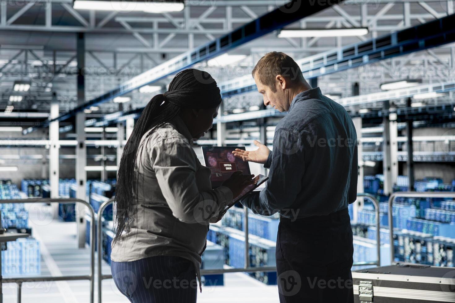 Team of data center technicians analyzing security breaches in firewall, trying to remove malware. Server farm coworkers doing brainstorming, removing virus spreading across hardware rigs Pro Photo