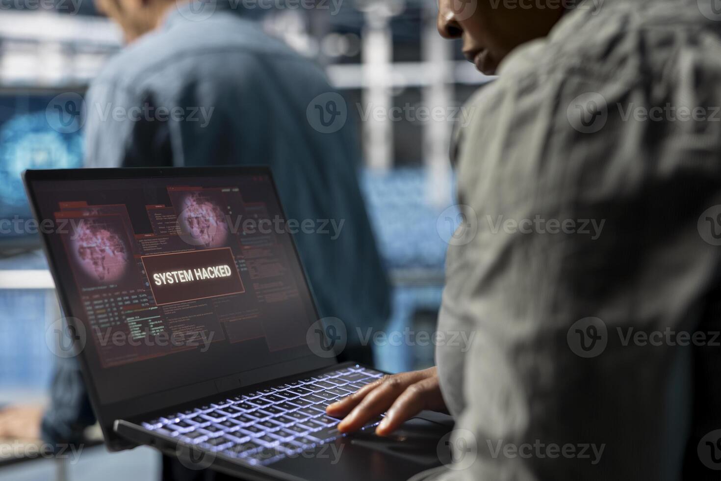 Close up of data center technician trying to minimize damage of hacker stealing sensitive company data. Server farm worker alarmed by virus alert on notebook detected by security systems Pro Photo