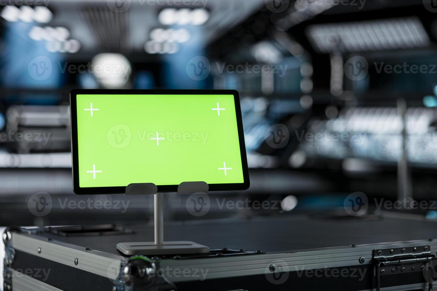 Close up of green screen mockup tablet in spacecraft on top of cargo container. Chroma key isolated screen device in futuristic spaceship during deep space mission operations Pro Photo