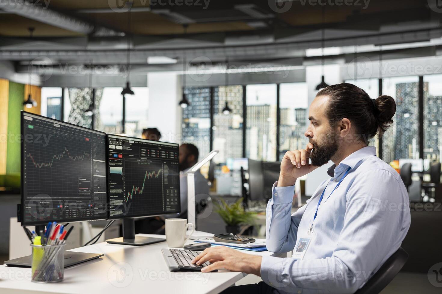 Trader in prop firm office analyzing market data and executing trades using trading software interface on PC. Stockbroker working for asset management company monitoring stock prices using computer Pro Photo
