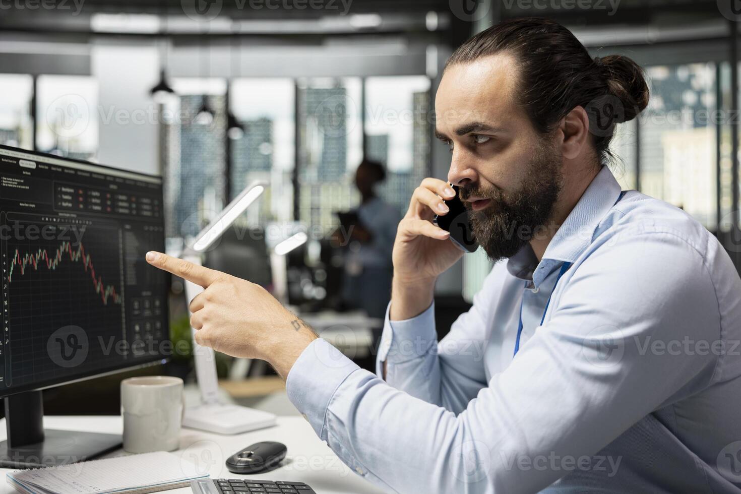 Stockbroker using smartphone to discuss with clients, executing buy and sell orders. Financial expert using mobile phone during telephone call with customer, advising on investment opportunities Pro Photo