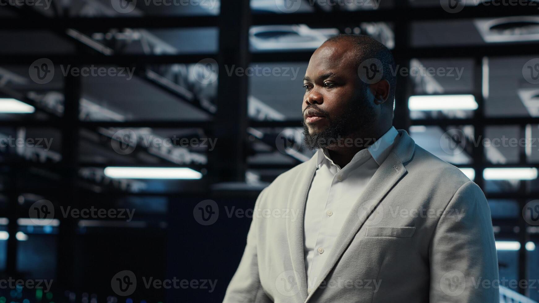 Admin working in high tech server hub capable of processing and storing vast amounts of data. African american IT specialist troubleshooting server rows controlling network resources, camera B Pro Photo