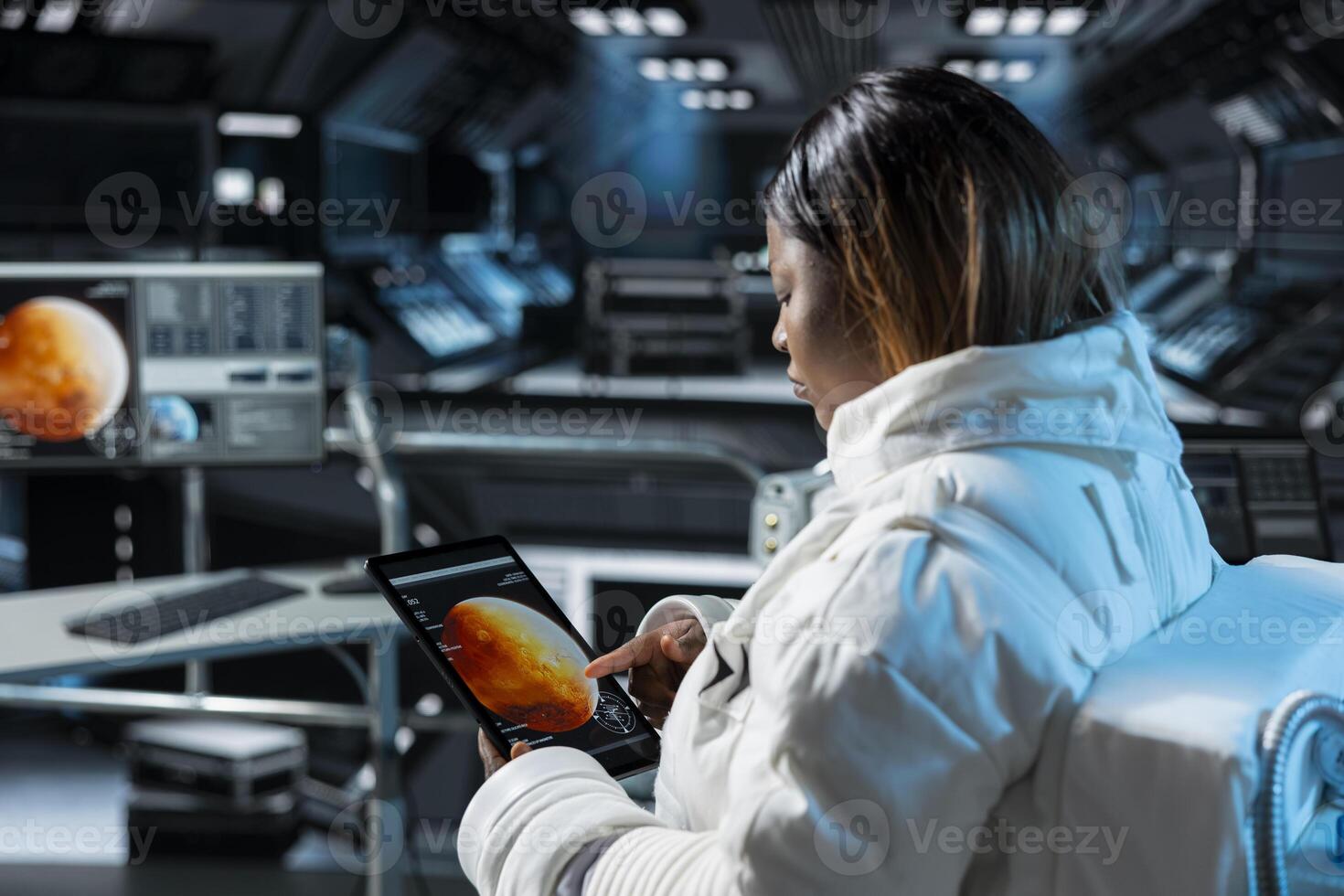 Astronaut prepares for space travel operations, reading Mars expedition status on device. Spaceman wearing spacesuit inside futuristic spacecraft monitoring red planet surface scan data on tablet Pro Photo