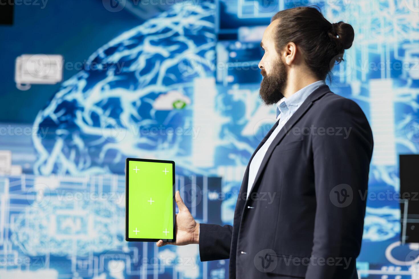 Surrounded by digital data and AI brain systems, businessman navigates virtual intelligence with a green screen on device. Using automation platforms for modern strategy and innovation. Pro Photo