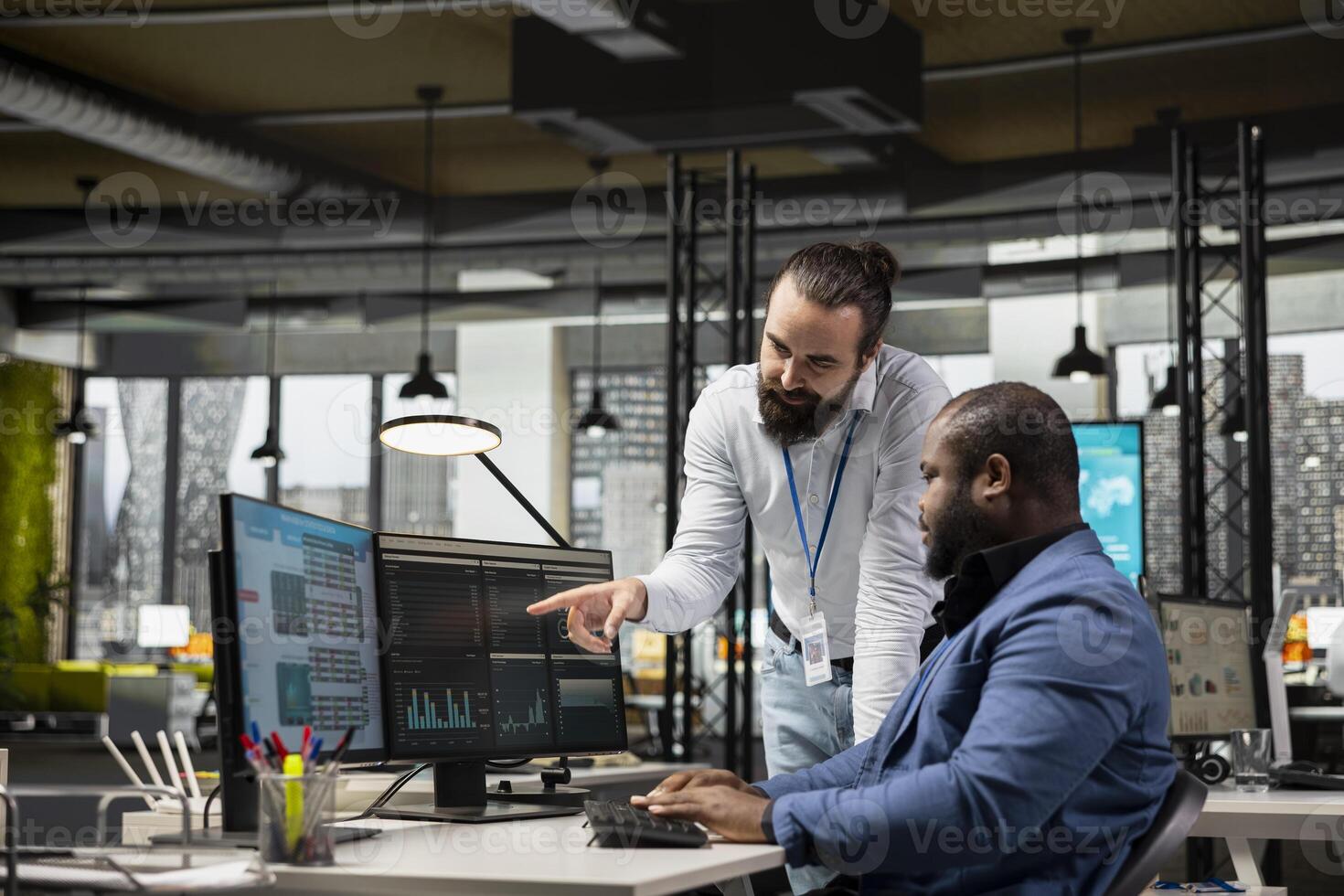 Administrator and assistant gather data from monthly reports, reviewing performance metrics and creating graphs that align with project goals. Teamwork for innovation and achievement. Pro Photo