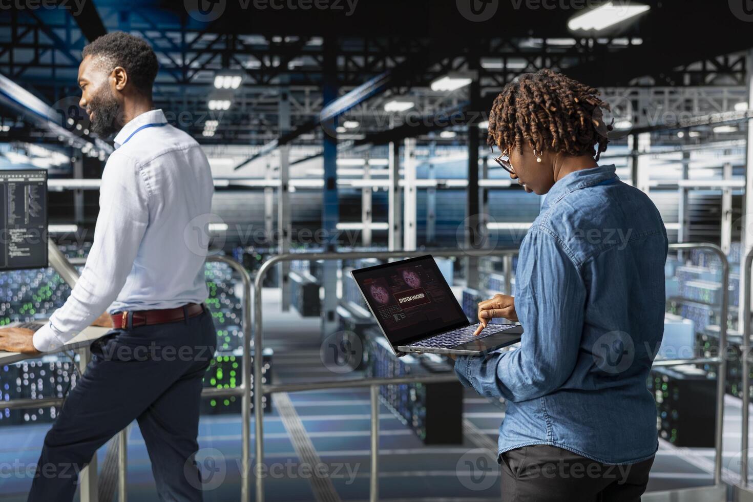 Woman expert in data center stressed by critical error popup on laptop during diagnostics session on industrial platform. Anxious staff troubleshooting system fault affecting performance. Pro Photo