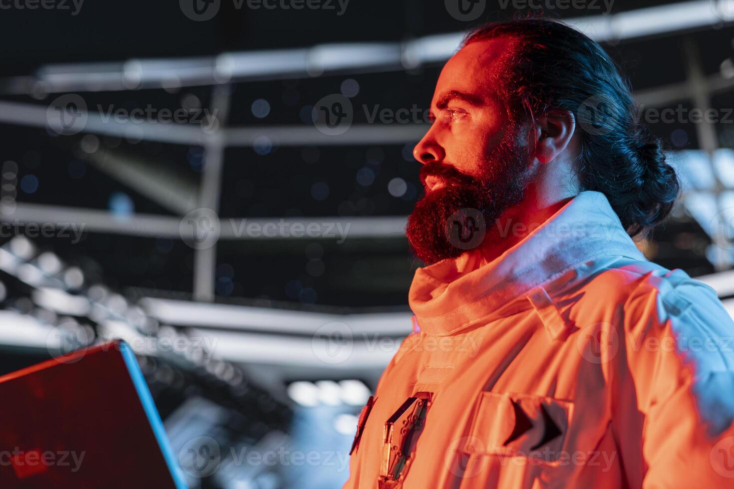 Spaceman seeing red warning light flashing during space travel operations. Astronaut wearing spacesuit inside futuristic spacecraft having trouble with hazard alarm in cockpit Pro Photo