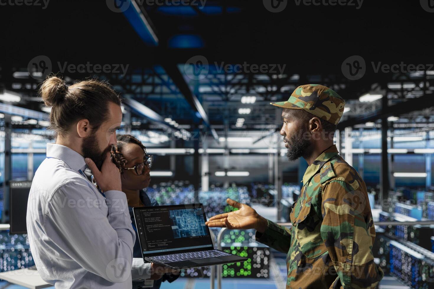 Army technicians in command center server farm using artificial intelligence to detect cyber threats. Military data center IT experts use AI detection software to secure defense systems. Pro Photo