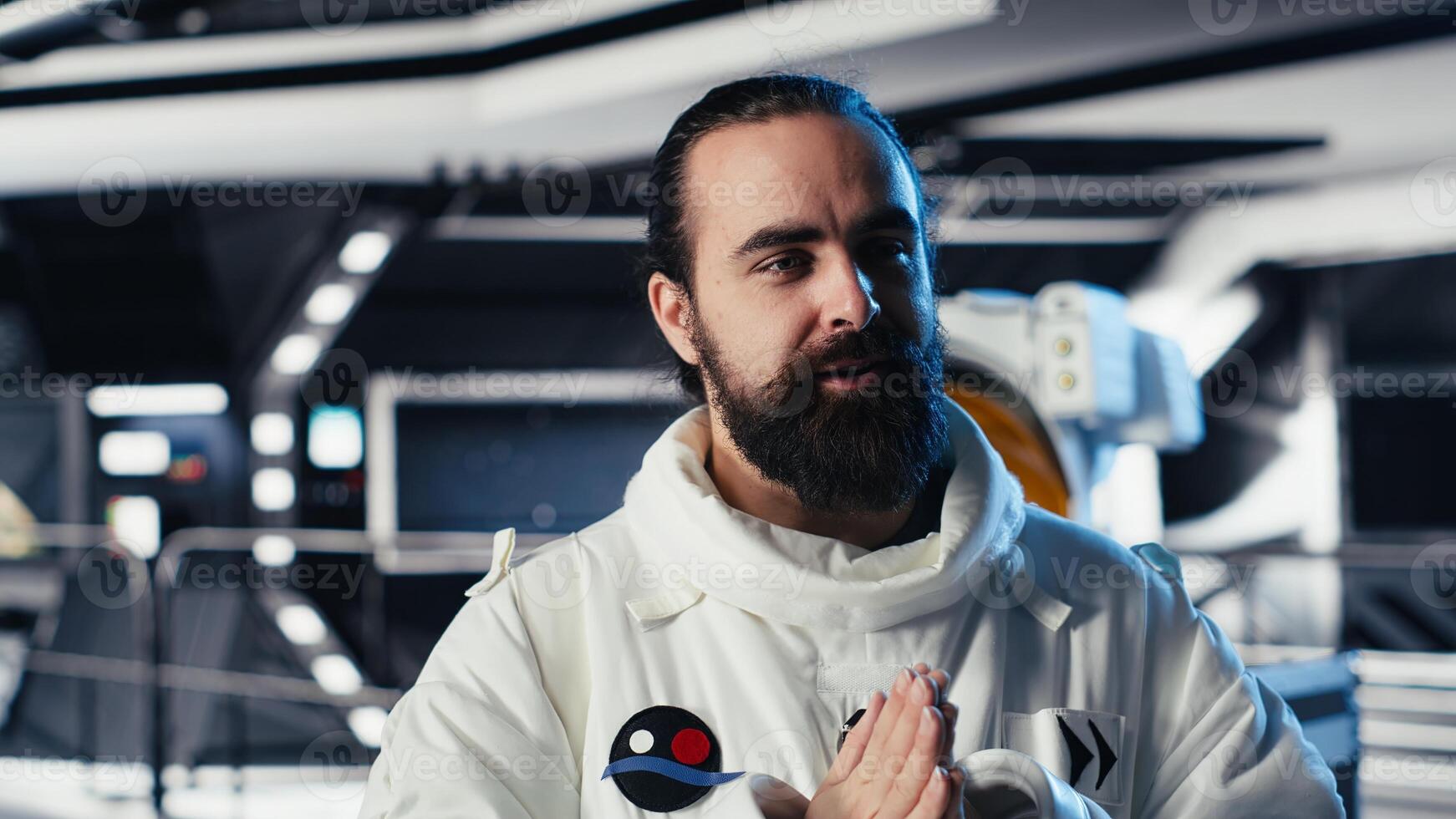 Cheerful astronaut doing videocall with Earth command center while aboard orbit station, sharing mission update. Happy cosmonaut talks with ground center team during communication link Pro Photo