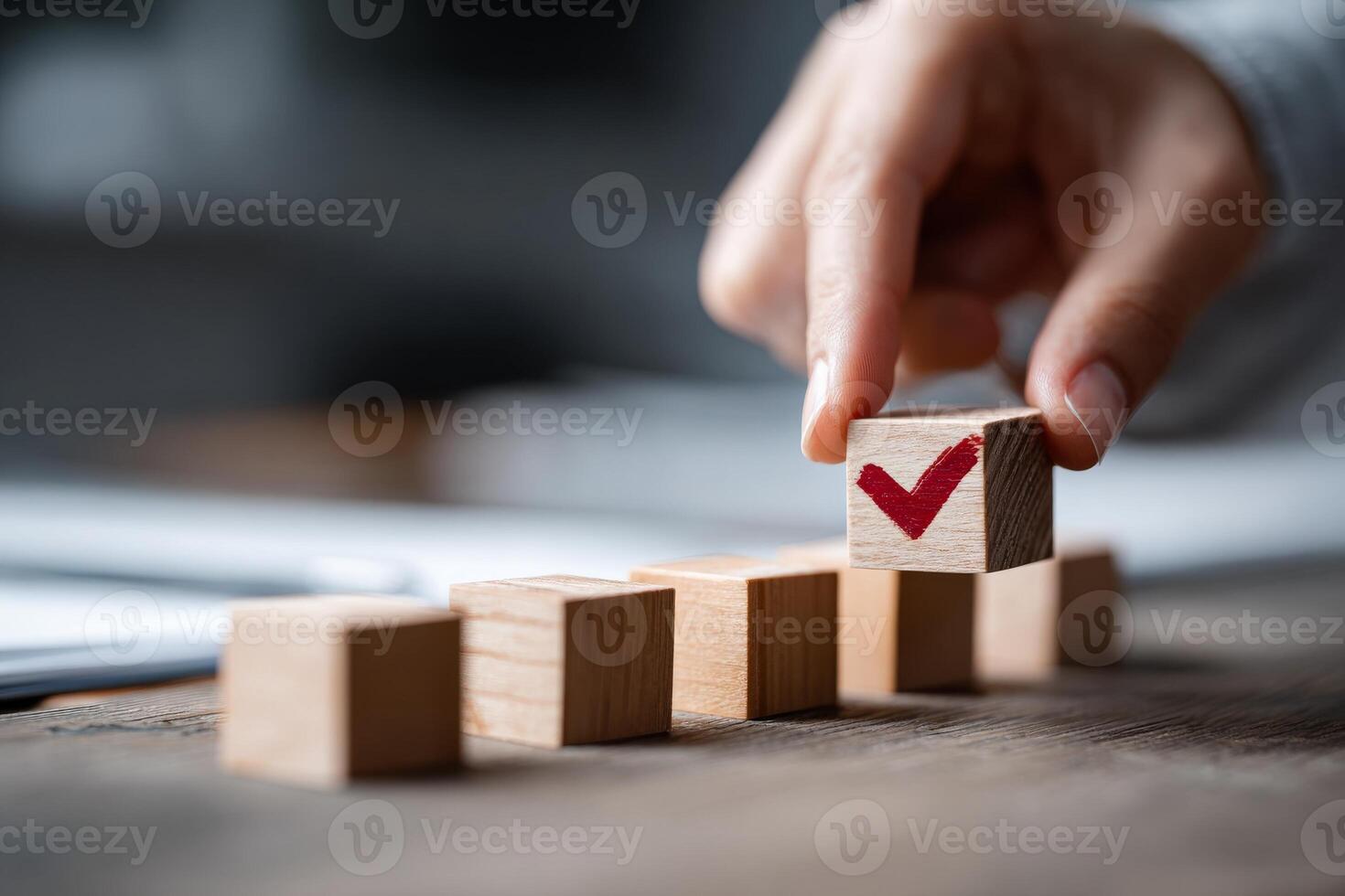 the checklist and task progress tracking concept. A hand placing the final checkmark on wooden blocks in a progress bar Pro Photo