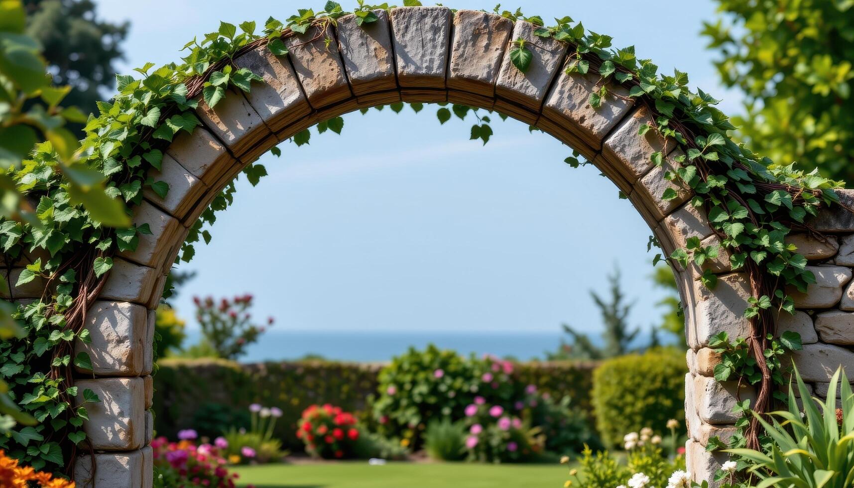 garden arch of stone wrapped in ivy, its surface dappled with shifting patterns of light. photo