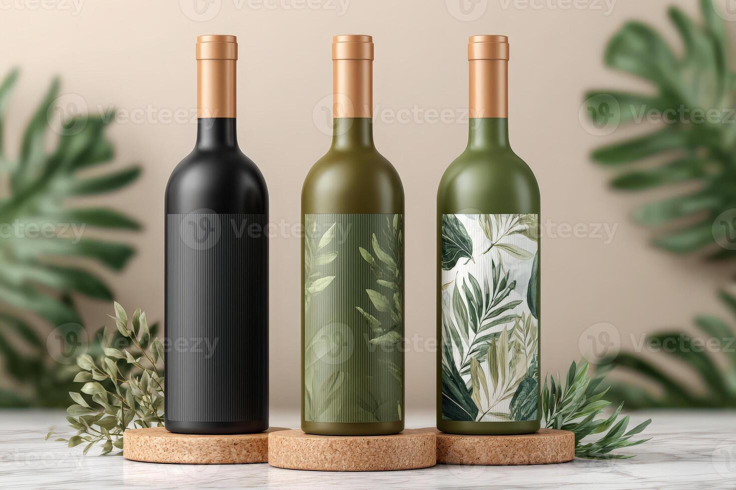 Three stylish wine bottles arranged on cork coasters feature unique labels showcasing green foliage designs. The setting is tranquil, surrounded by soft greenery and a neutral backdrop. Pro Photo