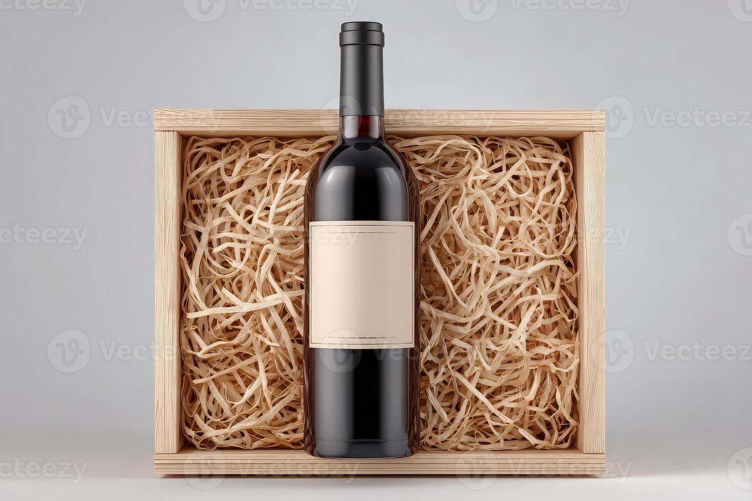 A sophisticated wine bottle sits upright in a wooden box lined with shredded straw, creating an appealing display perfect for gifting or showcasing at events. The box offers a rustic charm. Pro Photo