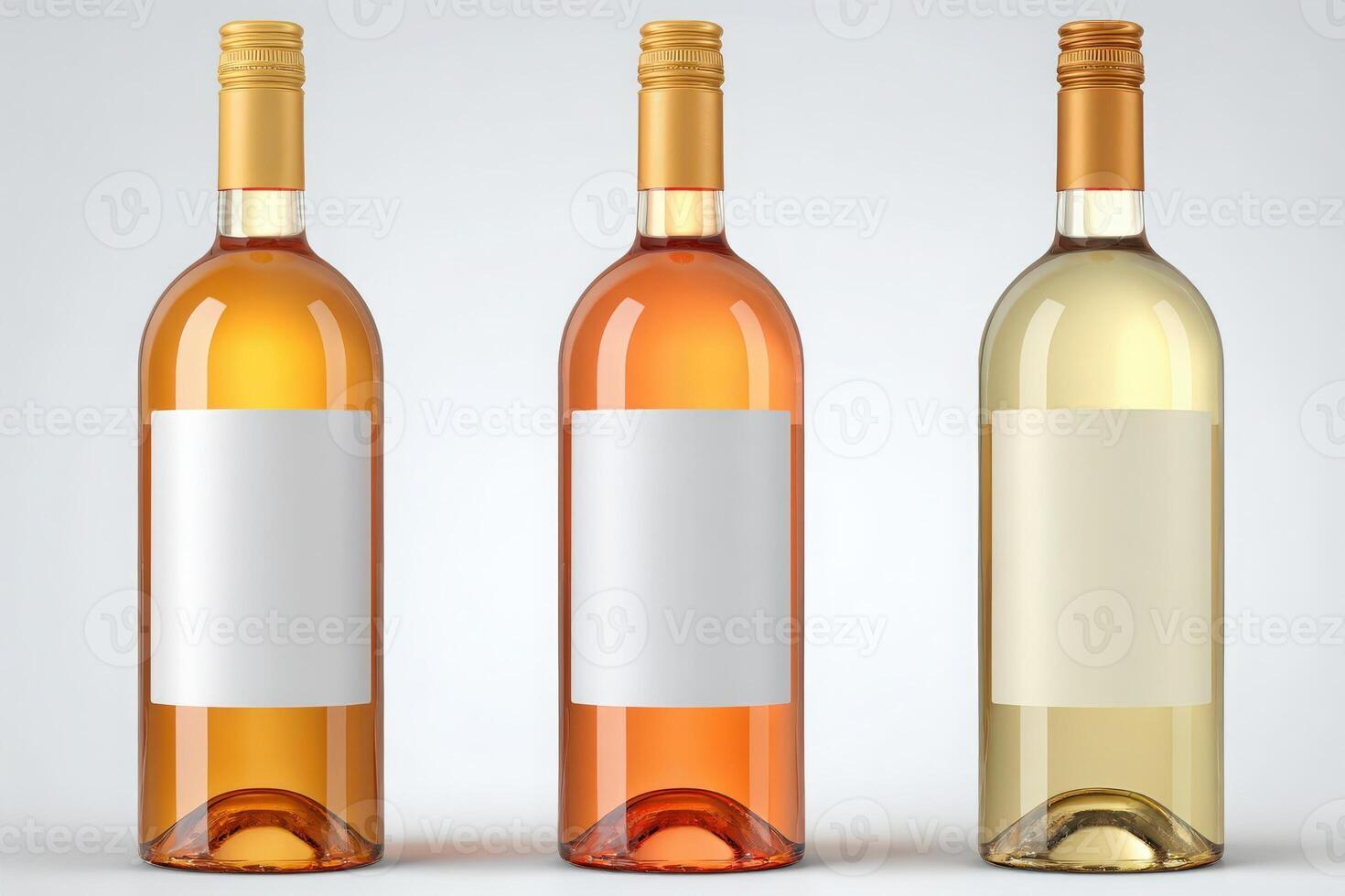 Three bottles of wine sit side by side on a clean surface, showcasing different shades of wine. Each bottle features a blank label for customization or branding. Pro Photo