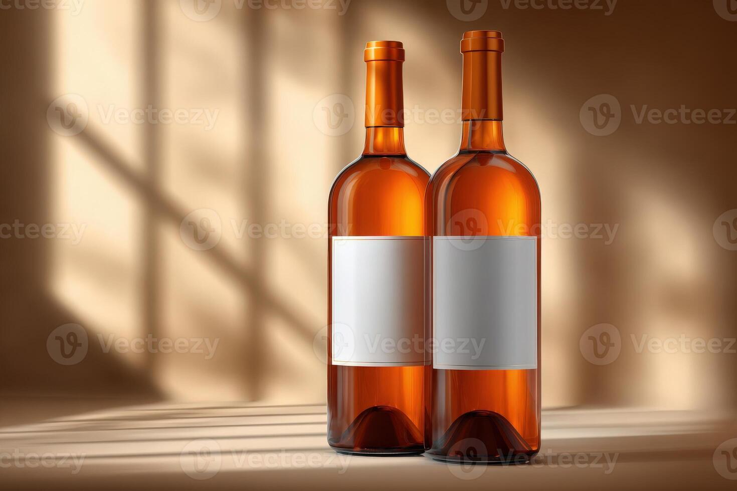 Two amber wine bottles stand together on a smooth surface. Soft light casts gentle shadows, highlighting their shapes. The bottles feature blank labels, suggesting potential customization. Pro Photo