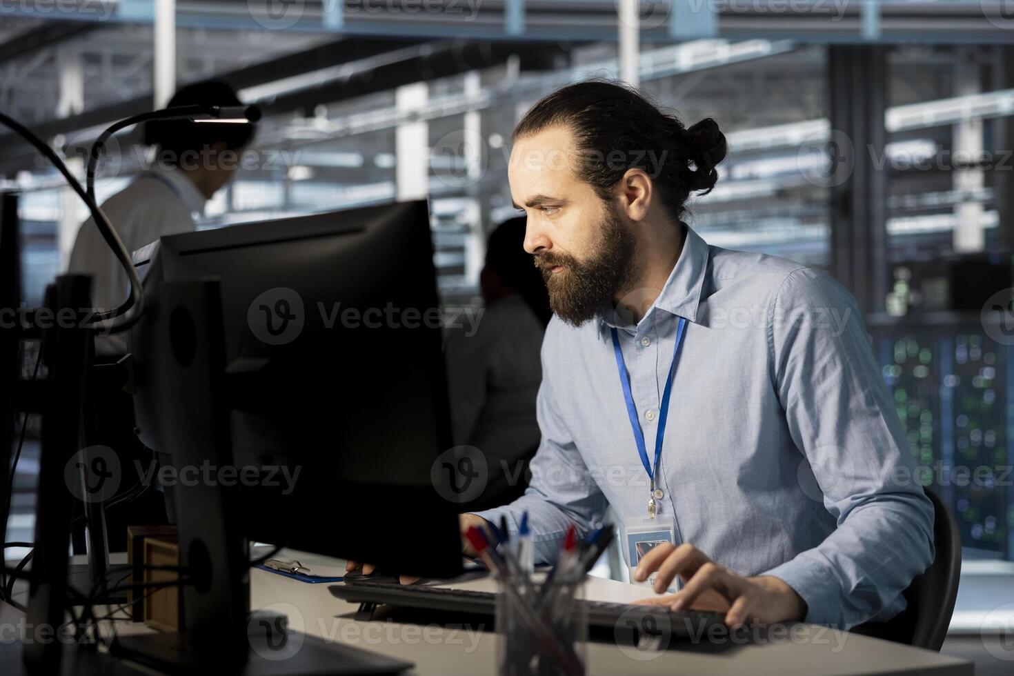 System administrator in data center doing software updates, verifying neural network parameters. Server hub IT expert using PC to inspect configurations, ensuring optimal application performance Pro Photo