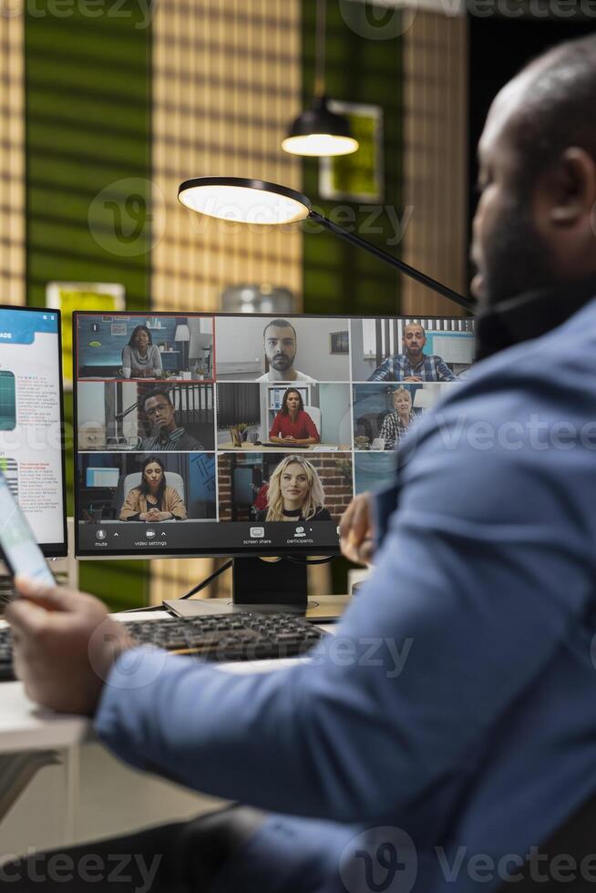 African american man attending a meeting on remote call, discussing with business partners about a new collaboration to expand the company internationally. Web chat event. Pro Photo